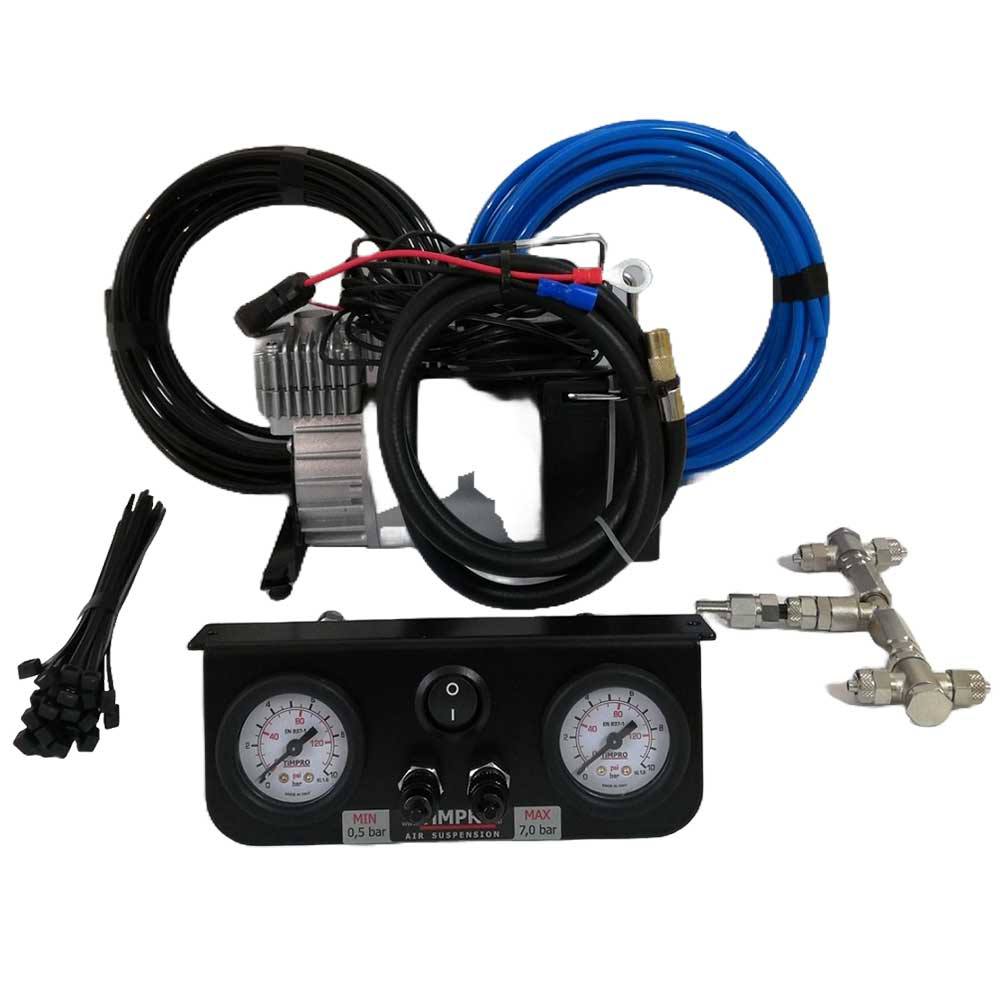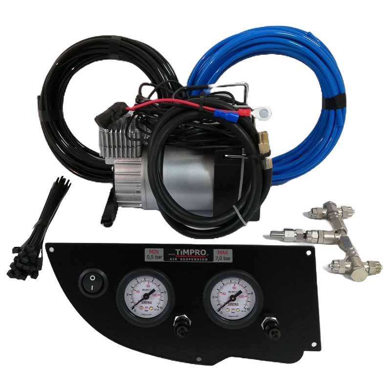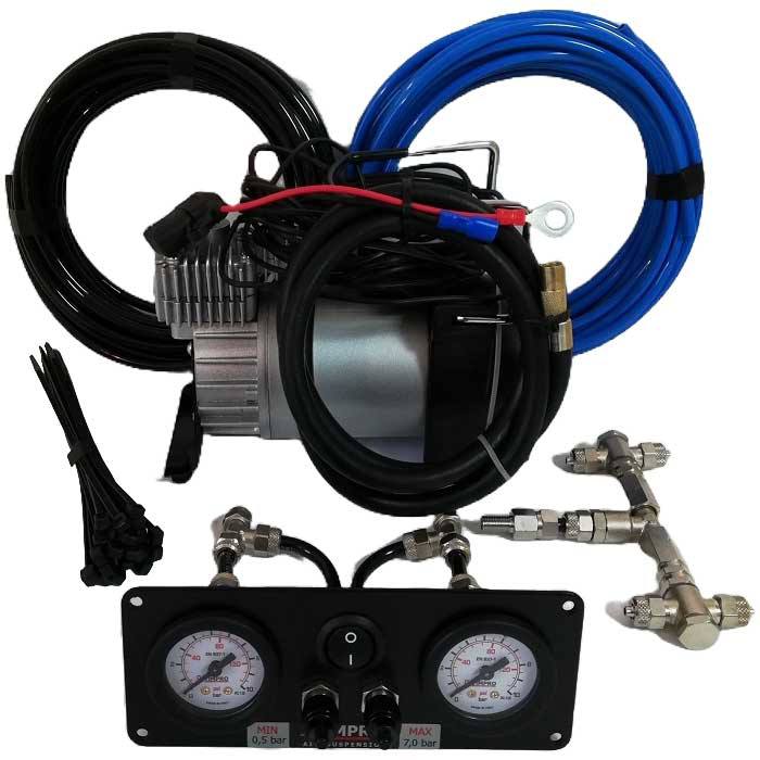 The set contains: control panel, two manometers, 2 valves, compressor switch, 12V compressor 35l/min, assembly of connections with two non-return valves, pneumatic hose 2x10 meters.